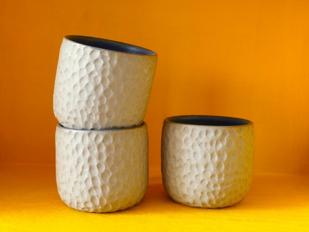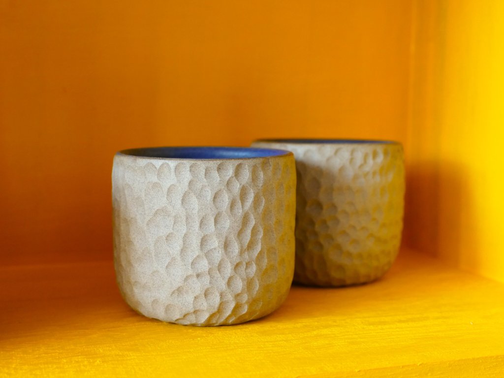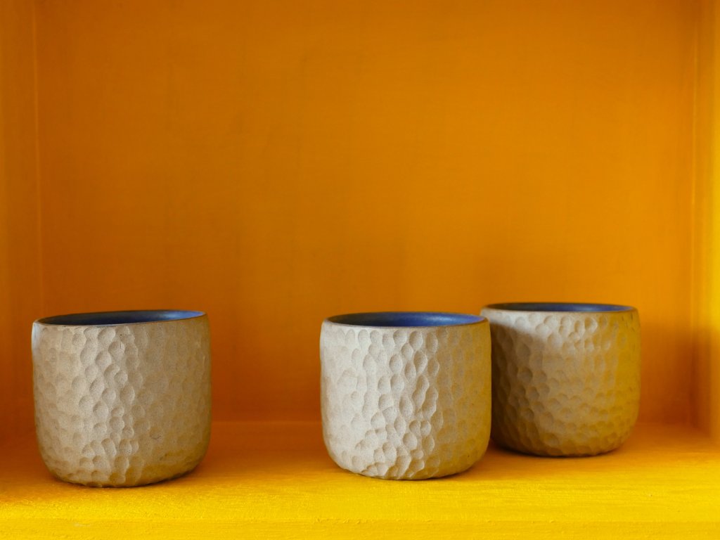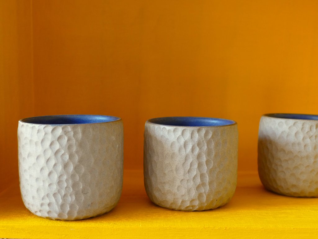 Tento pohárek maximálně přibližuje přirozenost keramické hlíny. Je nechaná bez glazury z vnější strany a tak se můžete těšit z pocitu přírodního materiálu. Hlína je zbarvená jemně do pískova a pěkně ji dotváří kontrastní modrá matná glazura na vnitřní straně pohárku.