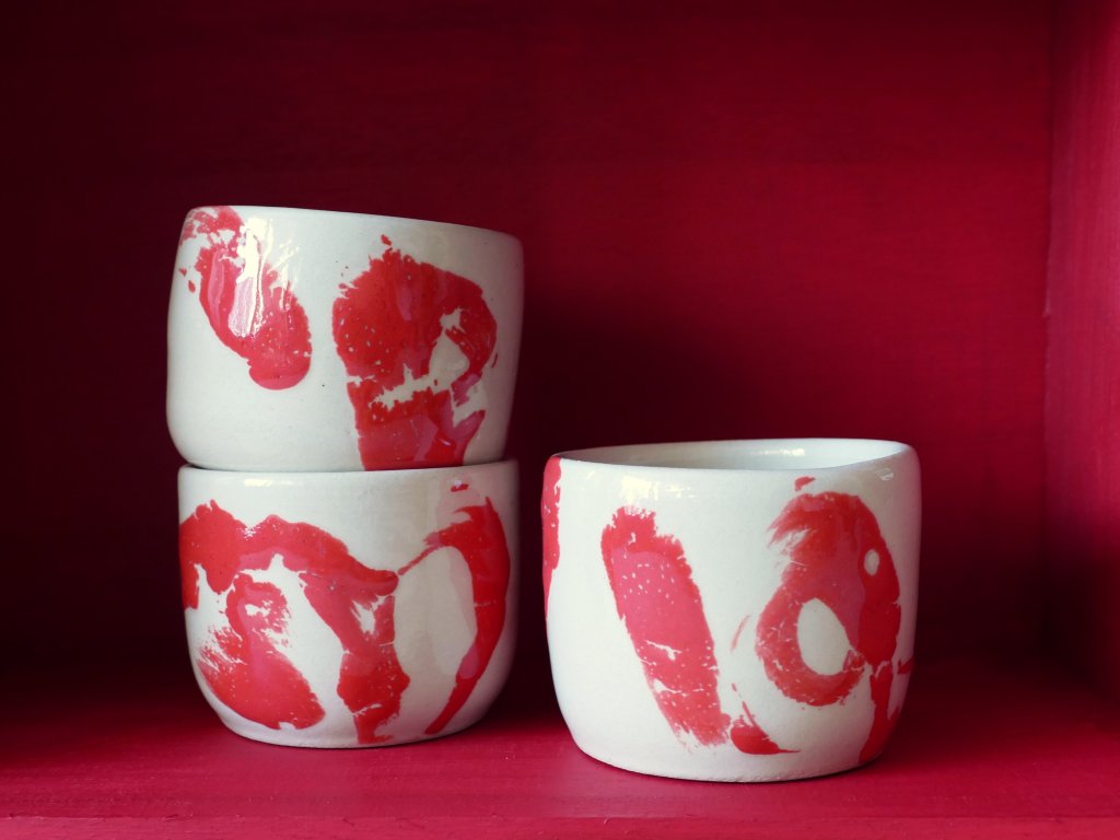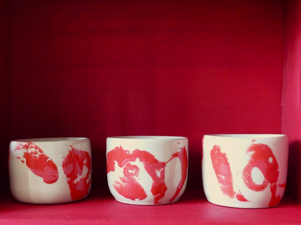 Výrazné pohárky, které vás získají abstraktními tahy štětce i kontrastem barev. Červená glazura versus světlá hlína je výrazná, ale zároveň harmonická kombinace.